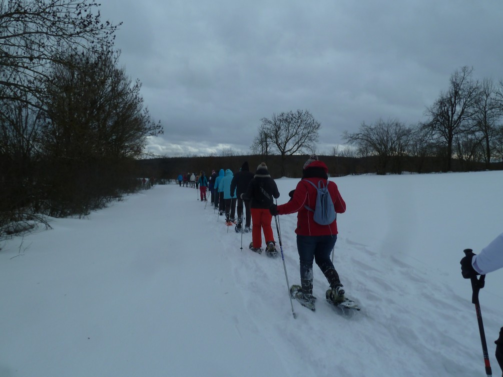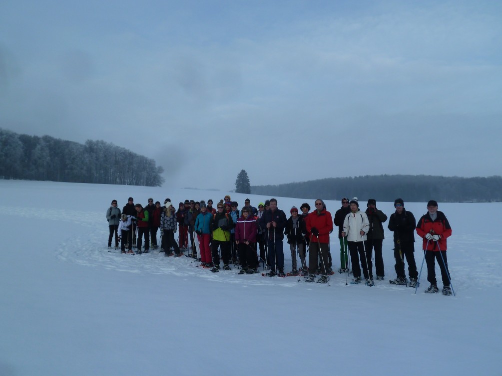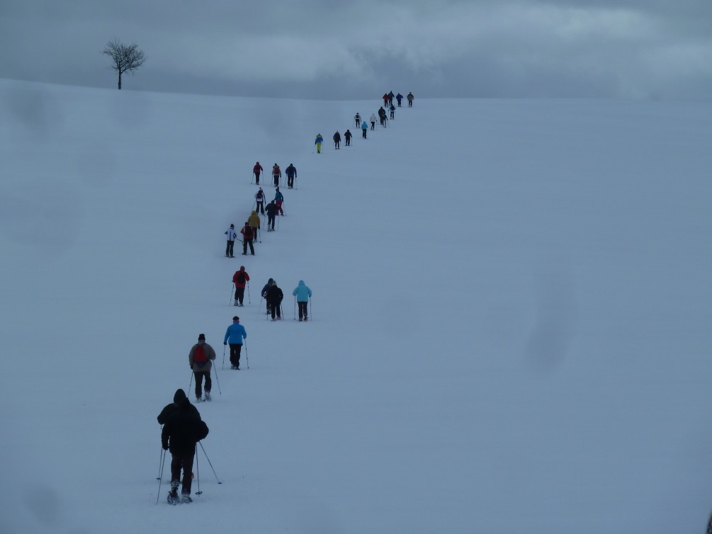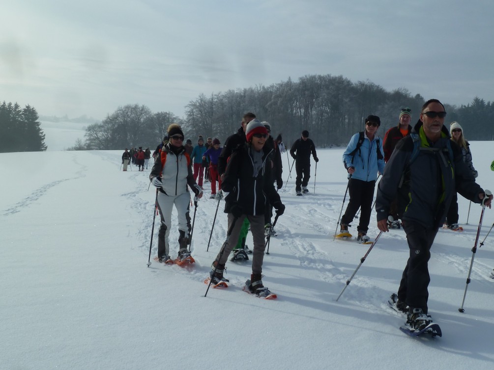 Von der Albhalle aus stapften 33 Schneeschuhwanderer Richtung Flugplatz.