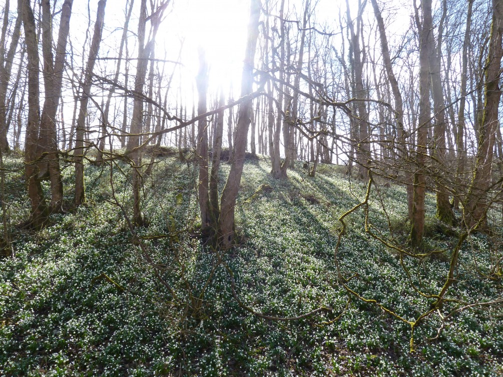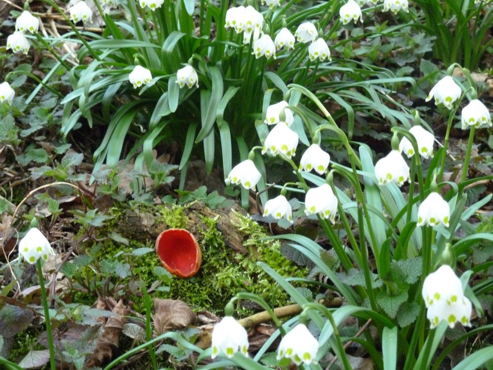 In Emeringen blühten die weiß grünen Märzenbecher, auch Frühlingsknotenblume genannt, um die Wette. Am Wegesrand konnte der sehr seltene zinnoberrote Kelchbecherling bewundert und ausgiebig fotografiert werden. Da die Donauauen überflutet waren mussten die Wanderführer öfters mal auf Alternativstrecken ausweichen. Die Braunsel, mit nur 920 m Länge der wohl kürzeste Nebenfluss der Donau, führte soviel Wasser, dass selbst die Brücke des ursprünglich geplanten Wanderweges komplett überschwemmt war. Weiterhin gabs für die gut gelaunten Wanderer viel zu sehen und zu erleben. Von Bibern angenagte und gefällte Bäume, weitere überflutete Wanderwege, und zu guter Letzt ein grandioser Blick vom Hochberg zum Bussen und vor allem zum herrlichen Alpenpanorama. Zu sehen waren das Zugspitzmassiv, die Allgäuer und Lechtaler Alpen bis hin zum Säntis.