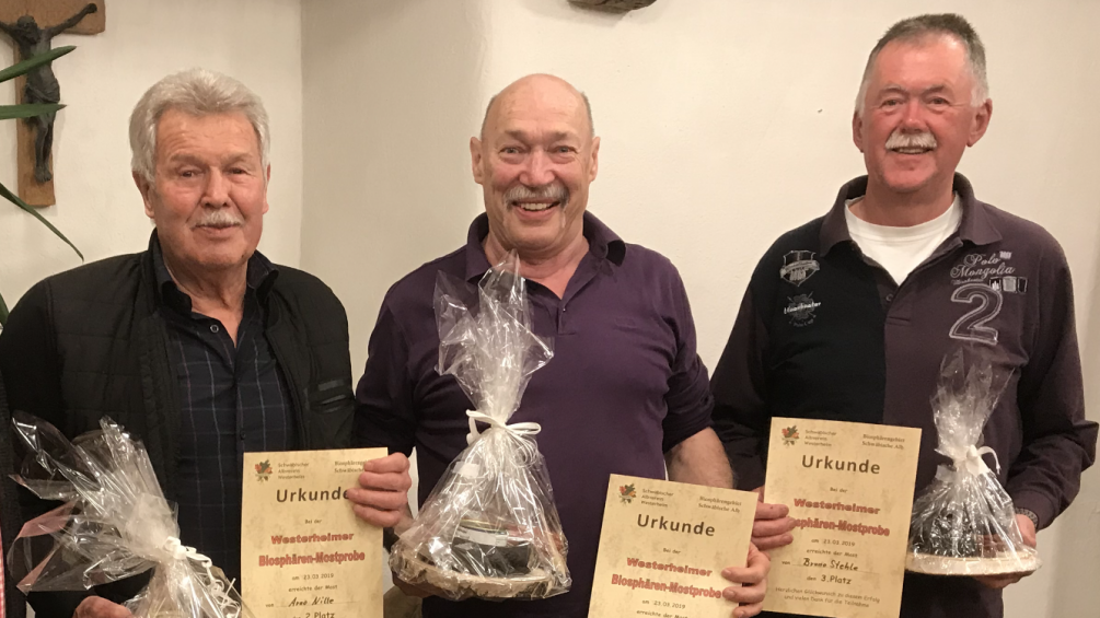 An der letzten Samstag stattgefundenen Mostprobe im alten Rathaus von Westerheim ging es recht lustig zu und mit jeden zu probierenden Most würde es auch fröhlicher. Zu Beginn brachten die Mostbesitzer ihren Most in neutralen Weinflaschen zur Bewertung. Alle Anwesenden bildeten die Jury und wurden von Moderator Manfred Rehm zu Beginn auf die verschiedenen Kriterien der Bewertung hingewiesen. Es wurden nach Farbe, Klarheit, Geruch, Geschmack und Nachklang Punkte verteilt. „Jeder soll nach seinem Geschmack und seiner Vorstellung eines guten Mostes die Punkte geben“ so Rehm. Bald wurde eifrig gefachsimpelt, „der ist aber flach“ oder „boa, der isch herzhaft“ war da zu hören. Zwischendurch wurde natürlich gevespert, Marlene Rehm servierte herzhaftes, wie Schwarzwurst, Käse und Griebenschmalz mit Brot. Nachdem alle Proben getestet waren und die Punkte gezählt waren, war Peter Knupfer neuer Mostkönig von der Biosphärenmostprobe. Mit 188 Punkten Vorsprung siegte Knupfer vor dem Vorjahressieger Arno Nille. Auf Platz drei landete, mit nur 12 Punkten Unterschied, der Most von Bruno Stehle, dem Vizekönig der letzten Mostprobe. Alle drei bekamen ein Vesperbrettchen mit verschiedenen Würsten darauf. Zur Erinnerung bekamen alle Teilnehmer eine Urkunde überreicht. Bericht und Foto: Manne Rehm