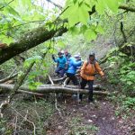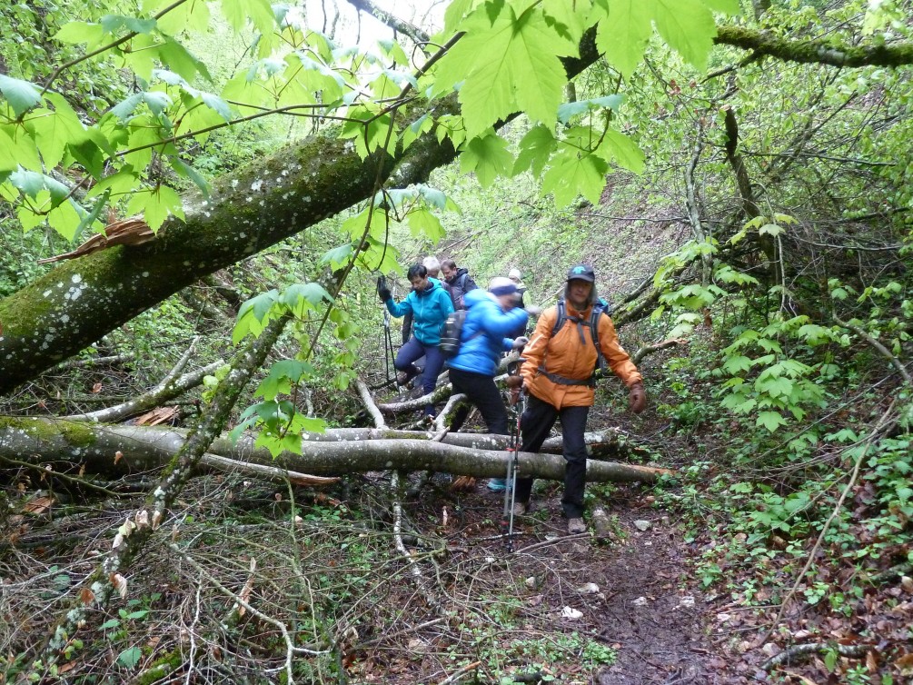 Durch den Bannwald der Biosphärenkernzone führte der Weg hinab. Umgestürzte Bäume und Äste mussten überstiegen werden, dafür entschädigte die herrliche Natur mit Urwaldcharakter die Wanderer. Auf Serpentinenpfaden wurde die Ruine Sperberseck erreicht, und am Burgbrunnen zeigte sich dann auch noch die Sonne.