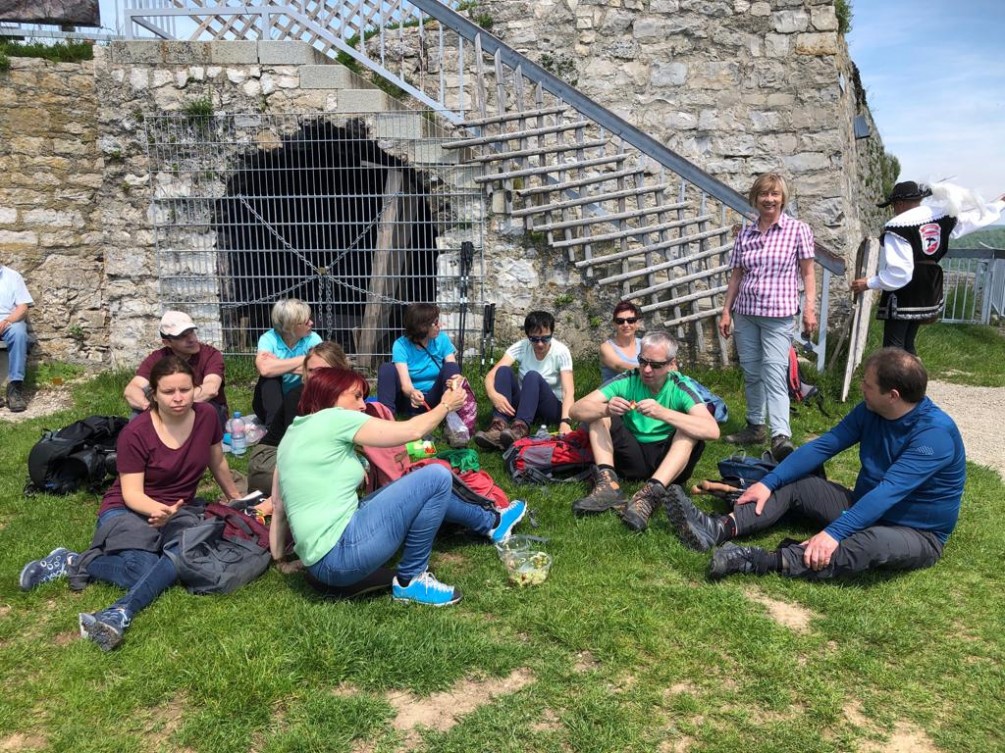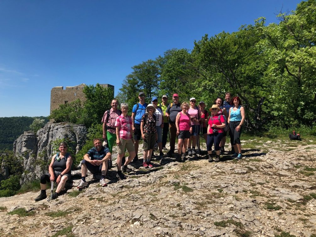 Gestärkt und beindruckt von den herrlichen Tropfsteinen ging es weiter über das Bahnhöfle zur Burgruine Reußenstein. Dort erzählte die Wanderführerin Kerstin Weber die Sage um den Riesen „Heim“ von „Heimenstein“.