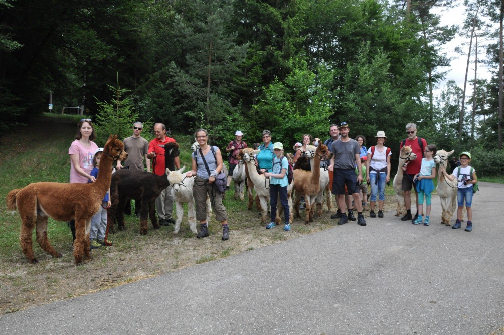 Letzten Sonntag stand eine ganz besondere Familienwanderung des Albvereins an: Die gut gelaunte Gruppe bestehend aus 13 Erwachsenen und 11 Kindern begab sich gemeinsam mit ca. 15 Alpakas auf eine zweistündige Tour rund um den Heimathof der Tiere in Heroldstatt-Sontheim. Manche(r) war anfänglich noch etwas skeptisch ob des bevorstehenden Abenteuers, aber schon nach kurzer Zeit bewahrheitete sich, was Züchter Andreas Kuhn uns versprochen hatte: Wir gewöhnten uns an den Umgang mit den schönen Tieren und sie sich an uns, so dass wir eine außergewöhnliche Wanderung durch das schöne Tiefental genießen konnten. Zahlreiche interessante Informationen über die Lebensweise und die vielen positiven Eigenschaften der ursprünglich nur wegen ihrer Wolle („Vlies der Götter“) gezüchteten Alpakas erhielten wir von unserem fachkundigen Führer. Kleine und große Wanderer freuten sich an der Gesellschaft der sanftäugigen Kamelart – und vergaßen dabei ganz, sich über die zurückgelegte Wanderstrecke Gedanken zu machen.