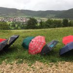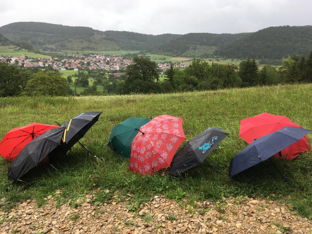 Los gings mit der Wanderung am Hexensattel zwischen Reichenbach und Oberböhringen. Eine 9 köpfige Wandergruppe zog gut gelaunt und beschirmt los.