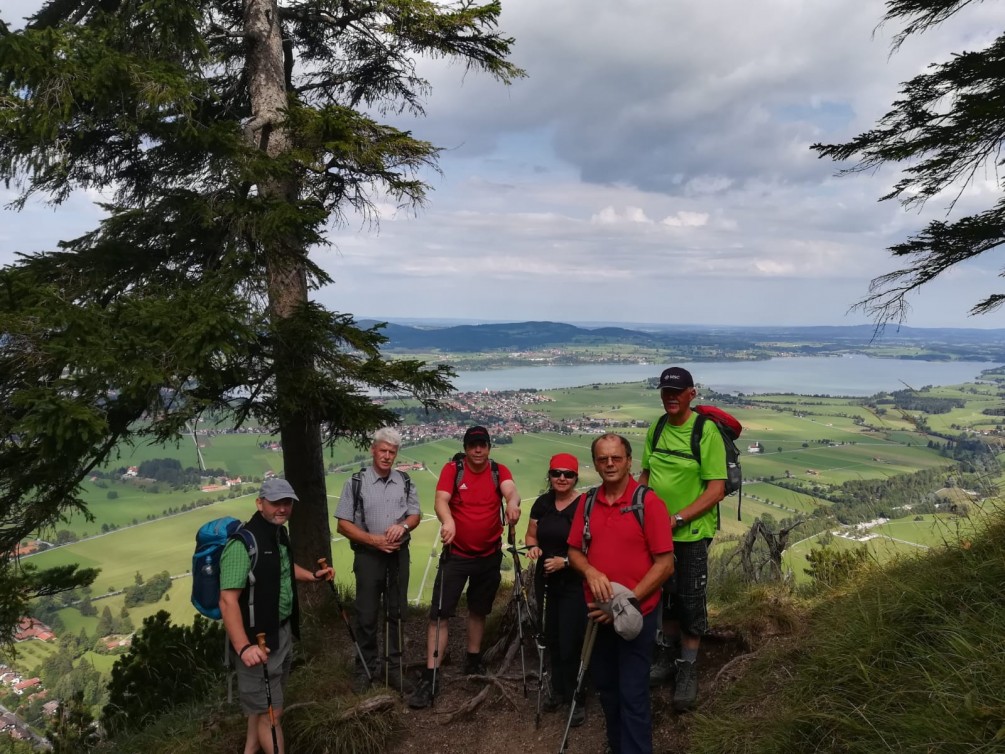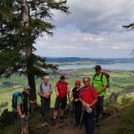 Auf der Marienbrücke angekommen hatten wir eine herrliche Aussicht und es hörte auf zu regnen. Nun ging es bergauf Richtung Tegelberg, sogar die Sonne kam hervor und so hatten wir grandiose Ausblicke auf das Schloss und das Allgäu. Unsere Rast auf dem Tegelberg konnten wir in der Sonne genießen. Nun machten wir uns an den Abstieg zur Talstation. Das Wetter wurde wieder schlechter, doch wir sind trocken an unseren Autos angekommen. Bei gutem Essen im Brauhaus in Schwangau waren alle der Meinung : “ Es war eine herrliche Wanderung mit einer tollen Gruppe.“ Dass
