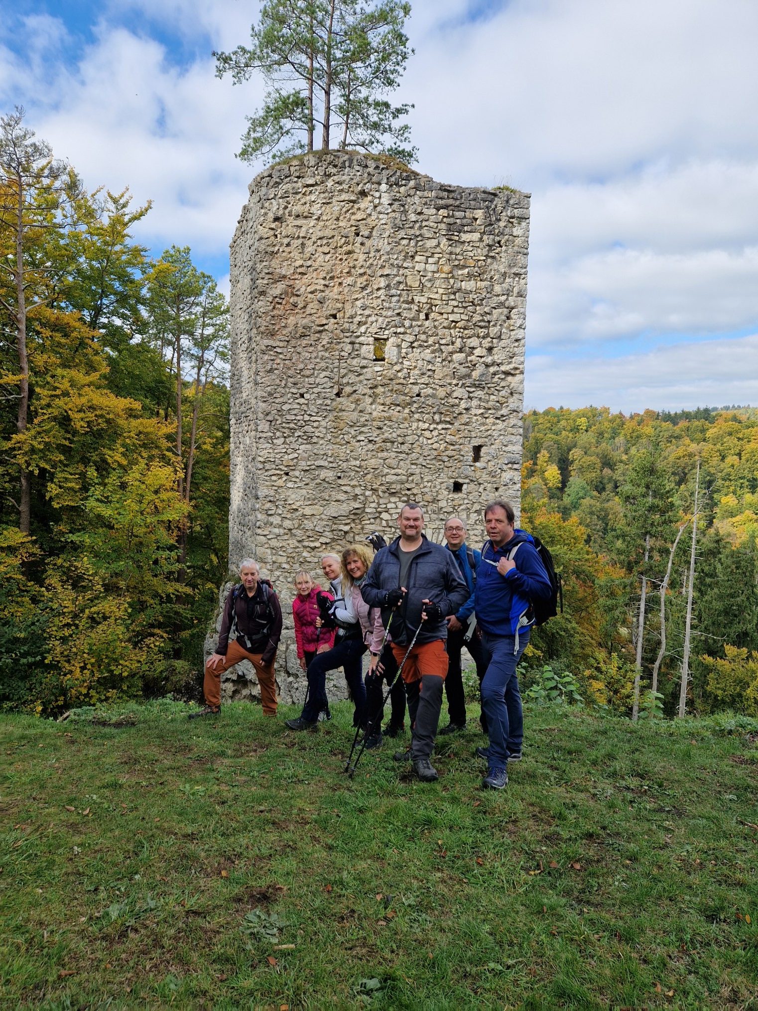 Nach dem vielen Regen der letzten Tage freuten wir uns in der Sonne zu wandern. Am Wanderparkplatz Bassgeige ging unsere Rundwanderung los und auf Naturwegen ging es durch den bunten Herbstwald zum Bruckener Felsen. Hier sah man weit ins Land. Auf dem HW 1 ging es ständig am Albtrauf entlang bis zum Beurener Felsen. Auch hier hatten wir wieder eine schöne Aussicht, diesmal zum Hohen Neuffen und weit an der Albkante entlang. Unsere gemeinsame Schlußeinkehr fand im Gasthaus Lamm in Grabenstetten statt.