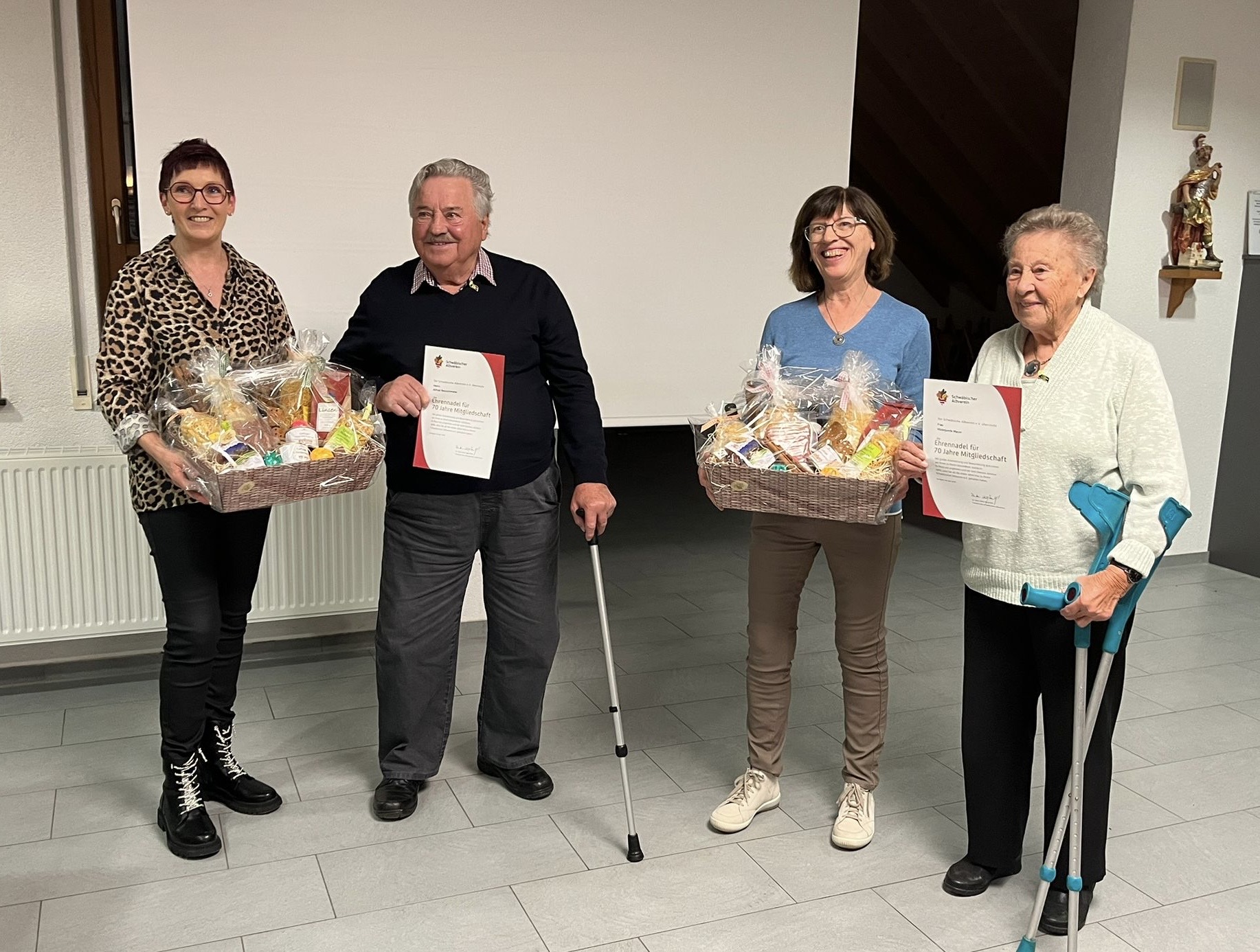 Hildegund Meyer und Alfred Rauschmaier sind seit sage und schreibe 70 Jahren Mitglieder im Albverein Westerheim, haben sich viele Jahre intensiv und tatkräftig eingebracht, sei es im Ausschuss, bei Diensten uvm. Die Vorsitzende dankte ihnen für die langjährige Treue und überreichte die Ehrennadel und die Urkunde sowie einen schönen Geschenkkorb mit regionalen Produkten.